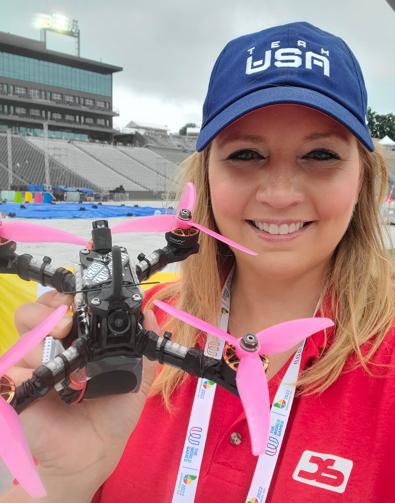 She is both a pilot and manager for Team Mach One, an all female drone racing team.