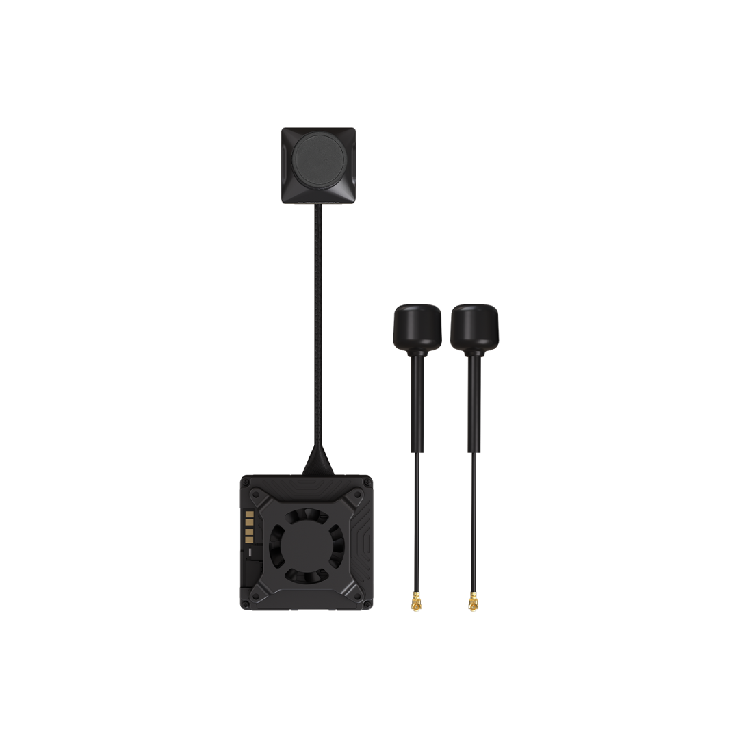 - Long-Range & Low-Latency Transmission: Equipped with dual antennas and Maximum 2W Power output( in accordance with local regulations), the system delivers up to 20KM (standard conditions) transmission distance with ultra-low 22ms latency. Wide voltage input (11.1V–25.2V) ensures strong, stable signals in various flight environments.