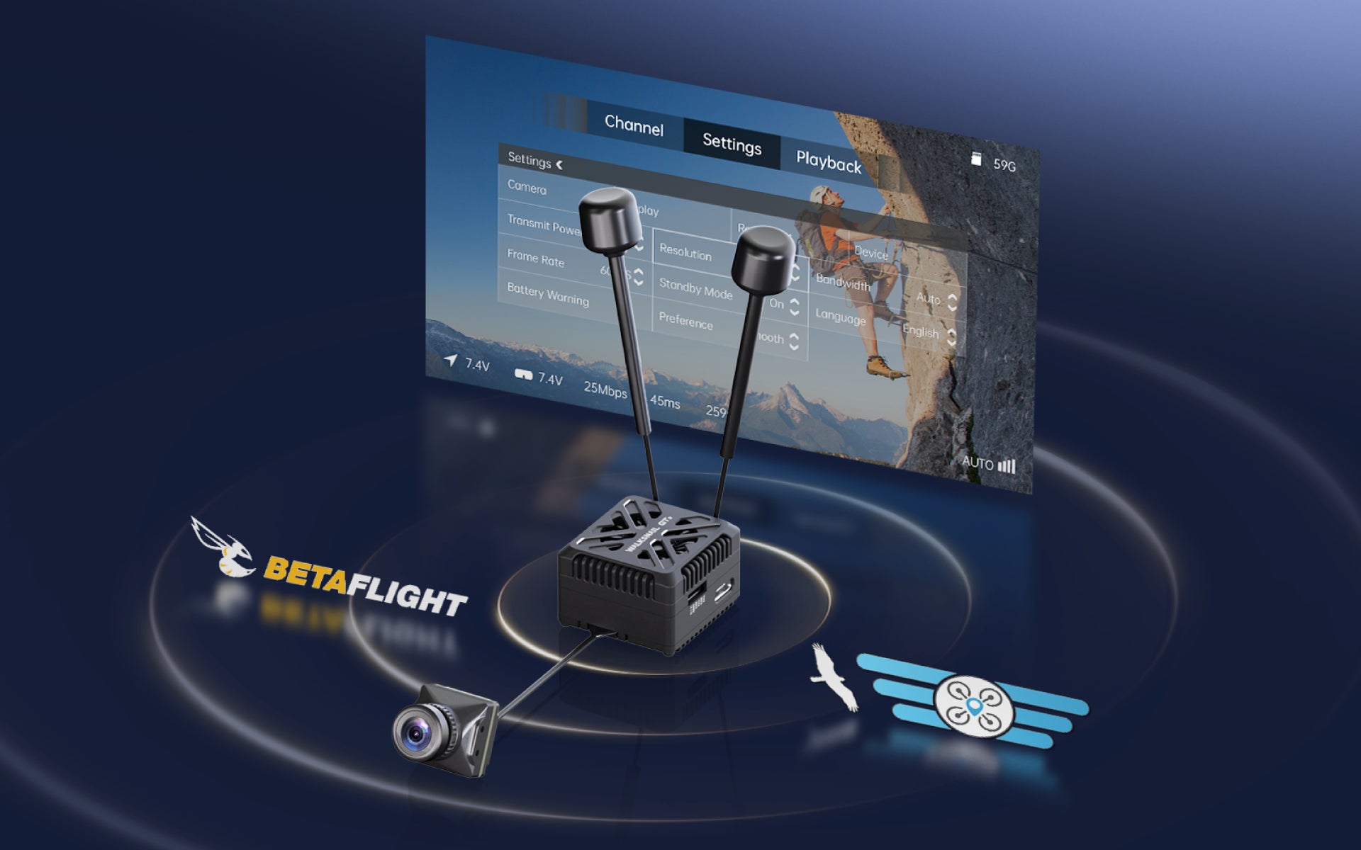 Supports both fixed channel and frequency hopping modes. When frequency hopping is active, it continuously scans and assesses channel quality during flight. Upon detecting interference, it switches to a clearer channel within milliseconds for seamless hopping, ensuring stable, clear and uninterrupted video transmission