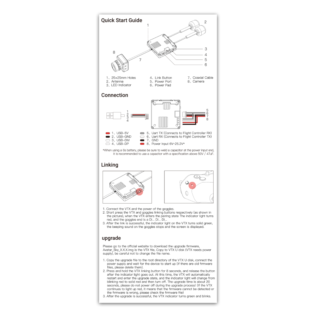 - New VTX with enhanced TVS protection and support for up to 6S. With a wide input voltage the range of 6V to 25.2V, our VTX delivers unmatched stability. Enjoy unparalleled performance and take your FPV adventures to new heights with our cutting-edge technology.